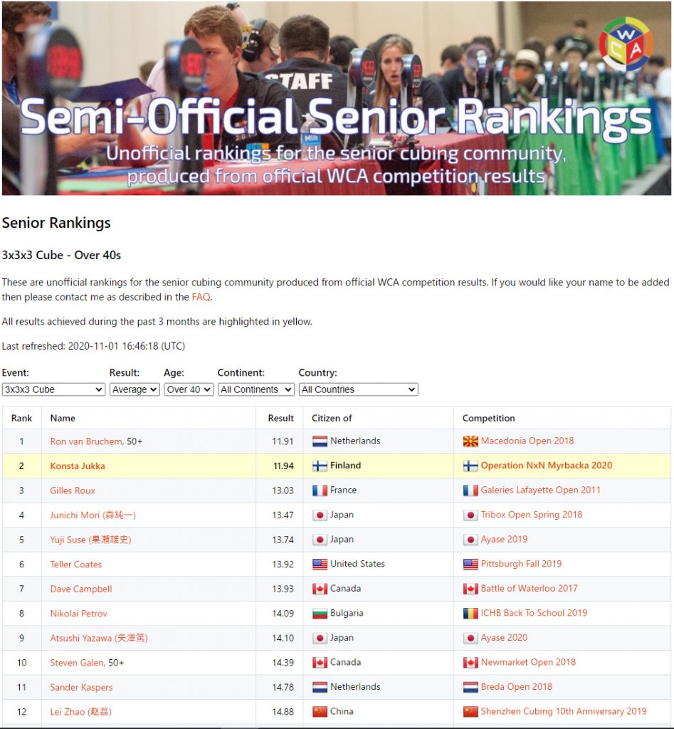 年代別ランキングについてはキューバ―でも知ってる人が少ないと思うので説明します。WCAの公認協議で40歳になってから出した記録でランキングされます。